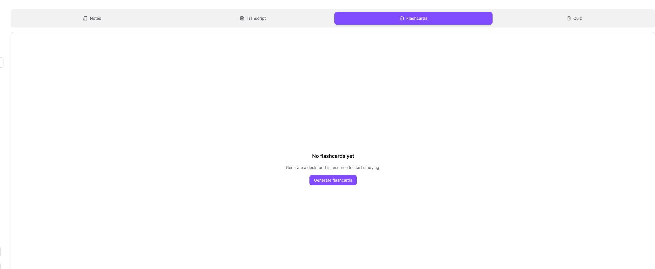 - Switch to the Flashcards tab — generate flashcards from your notes in one click